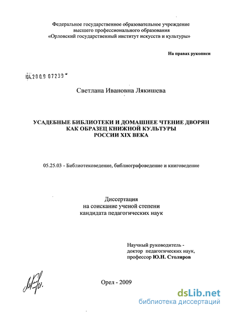 В одной работе нет возможности одинаково подробно рассмотреть все усадебные библиотеки России XIX в. - их несколько тысяч (цифра не установлена). Поэтому в исследовании приводится среднестатистическая русская усадьба, дворянин рассматривается как пользователь домашней библиотеки. В диссертации «усадебная библиотека» - «дворянская библиотека» - «домашняя библиотека» - «книжные собрания»; «дворянин» - «владелец усадьбы»; «домашнее чтение» - «семейное чтение»; «читательская культура» - «книжная культура» рассматриваются как синонимичные понятия.