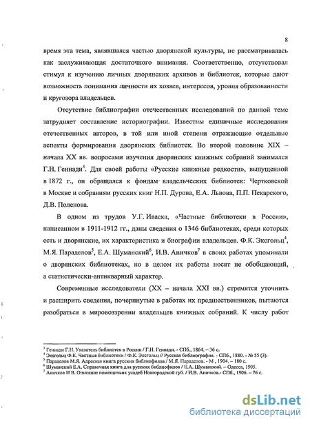 Разработанность темы исследования. По известным объективным историческим причинам об изучении усадебных библиотек существует мало сведений. Отсутствие библиографии отечественных исследований по данной теме затрудняет составление историографии. Известны единичные исследования отечественных авторов, в той или иной степени отражающие отдельные аспекты формирования дворянских библиотек. Во второй половине XIX - начала XX вв. вопросами изучения дворянских книжных собраний занимался Г.Н. Генна-