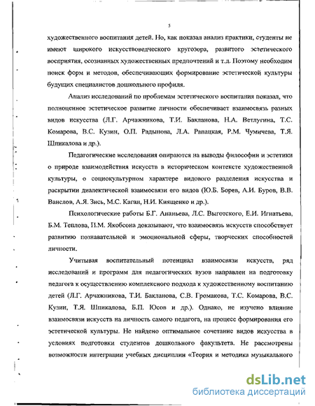 Учитывая воспитательный потенциал взаимосвязи искусств, ряд исследований и программ для педагогических вузов направлен на подготовку педагога к осуществлению комплексного подхода к художественному воспитанию детей (Л.Г. Арчажникова, Т.И. Бакланова, СВ. Громакова, Т.С. Комарова, B.C. Кузин, Т.Я. Шпикалова, Б.П. Юсов и др.). Однако, не изучено влияние взаимосвязи искусств на личность самого педагога, на процесс формирования его эстетической культуры. Не найдено оптимальное сочетание видов искусства в условиях подготовки студентов дошкольного факультета. Не рассмотрены возможности интеграции учебных дисциплин «Теория и методика музыкального