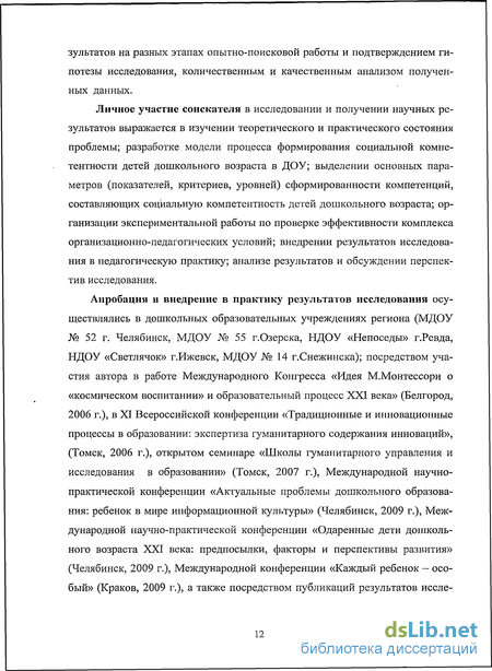 Личное участие соискателя в исследовании и получении научных результатов выражается в изучении теоретического и практического состояния проблемы; разработке модели процесса формирования социальной компетентности детей дошкольного возраста в ДОУ; выделении основных параметров (показателей, критериев, уровней) сформированности компетенций, составляющих социальную компетентность детей дошкольного возраста; организации экспериментальной работы по проверке эффективности комплекса организационно-педагогических условий; внедрении результатов исследования в педагогическую практику; анализе результатов и обсуждении перспектив исследования.