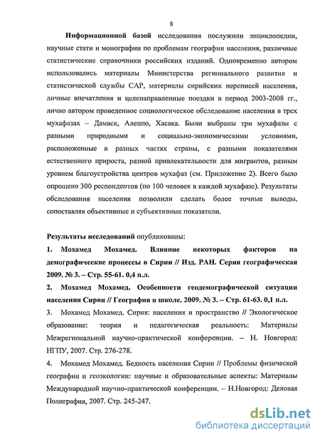 Информационной базой исследования послужили энциклопедии, научные стати и монографии по проблемам географии населения, различные статистические справочники российских изданий. Одновременно автором использовались материалы Министерства регионального развития и статистической службы САР, материалы сирийских переписей населения, личные впечатления и целенаправленные поездки в период 2003-2008 гг., лично автором проведенное социологическое обследование населения в трех мухафазах - Дамаск, Алеппо, Хасака. Были выбраны три мухафазы с разными природными и социально-экономическими условиями, расположенные в разных частях страны, с разными показателями естественного прироста, разной привлекательности для мигрантов, разным уровнем благоустройства центров мухафаз (см. Приложение 2). Всего было опрошено 300 респондентов (по 100 человек в каждой мухафазе). Результаты обследования населения позволили сделать более точные выводы, сопоставляя объективные и субъективные показатели.