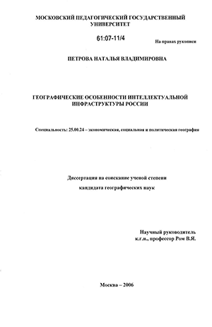 Объект исследования: интеллектуальная инфраструктура России. Предмет исследования: географическое исследование и анализ размещения и взаимодействия элементов интеллектуальной инфраструктуры в России и ее районах.