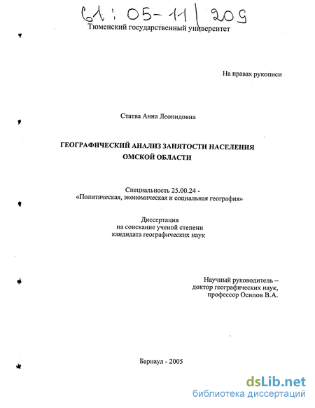 Цель диссертационной работы - анализ территориальных различий в структуре занятости населения Омской области по административным районам, выявление детерминирующих их факторов для выработки предложений по совершенствованию региональной политики занятости.