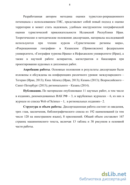 Практическая значимость работы заключается в возможности использования методики, результатов и выводов диссертации в практике стратегического планирования, при разработке целевых и комплексных программ, в деле практической организации туризма как для провинции Исфахан так и для Исламской Республики Иран в целом.