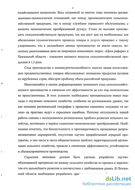 Актуальность работы. Исследование территориальной организации сельского хозяйства и его динамики - одна из важнейших задач современной российской географии и социально-экономической географии в частности. Это связано, во-первых, с распадом СССР, в системе территориального разделения труда которого Россия занимала определенное положение, во-вторых, - с глубокими социально-экономическими преобразованиями во всех регионах стра-ны. Россия переживает тяжелый системный социально-экономический кризис, особенно сильно отразившийся на сельских регионах.