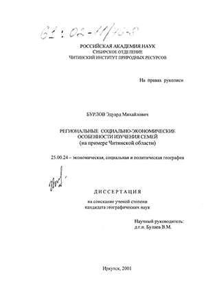 Бурлов Эдуард Михайлович. Региональные социально-экономические особенности изучения семей : На примере Читинской области : диссертация ... кандидата географических наук : 25.00.24.- Иркутск, 2001.- 154 с.: ил. РГБ ОД, 61 02-11/46-8