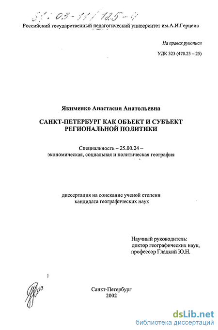 Якименко Анастасия Анатольевна. Санкт-Петербург как объект и субъект региональной политики : диссертация ... кандидата географических наук : 25.00.24.- Санкт-Петербург, 2002.- 238 с.: ил. РГБ ОД, 61 03-11/125-4