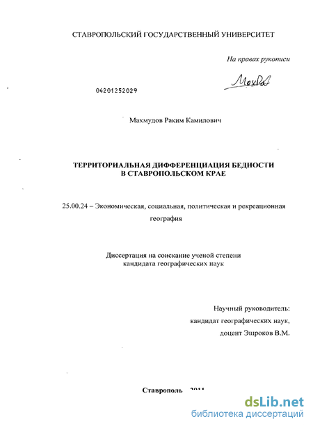 Цель диссертационного исследования заключается в выявлении особенностей территориальной дифференциации бедности в Ставропольском крае.