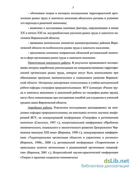 Практическая значимость работы. В результате проведенного исследования автором выработаны рекомендации по совершенствованию территориальной организации рынка труда, которые; могут быть использованы при обосновании программ экономического и социального развития Воронежской области. Материалы диссертации использованы в учебно-методической работе кафедры географии природопользования ВГУ (спецкурс «Рынок труда и занятость населения» и дипломной работы по географии рынка труда), могут быть использованы при составлении пособий для студентов и учителей средних школ Воронежской области.