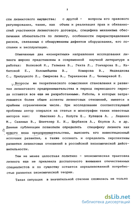 _Вопросы же теоретического осмысления становления и развития лизингового предпринимательства в период переходного периода остаются все еще не разработанными. Работы, в которых затрагиваются более общие аспекты лизинговых отношений, имеются в крайнем ограниченном числе. При исследовании соответствующей проблемы автор опирался на статьи и монографии таких известных авторов как: Ивасенко А., Колуга Е., Кулешов А. , Лещенко М., Савиных В., Шпиттлер X. И., Щербаков А., Юсупов А. и др. Данные публикации позволили определить специфику лизинга как нового вида предпринимательства, выяснить его инвестиционный источник развития, а также осознать и определить перспективы развития лизинговых отношений в российской экономической действительности.
