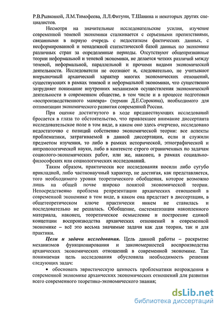 Цели и задачи исследования. Цель данной работы - раскрытие механизмов функционирования и закономерностей воспроизводства архаических экономических отношений в современной экономике. Так понимаемая цель исследования обусловила необходимость решения следующих задач: