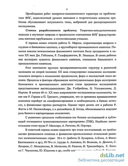 В советский период можно выделить три этапа исследований, по проблематике финансового капитала и финансово-промышленных отношений развитых капиталистических стран: 20-е гг. (работы Н. Бухарина, А.Кона, А Финн-Енотаевского и др.), 50-70-е гг. (труды А. Аникина, М. Волкова, А, Демина, С. Лазарева, С. Меньшикова, В. Мотылева, Н. Раскова, И. Трахтенберга, Е. Хеси-на Г. Черникова, Ю. Юданова и др.; особо следует отметить работу В. Бовыки-