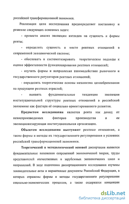 Целью диссертационного исследования является анализ специфики функционирования рентных отношений и теоретическое обоснование сущности, форм и масштабов их государственного регулирования в условиях