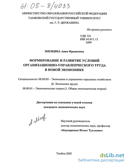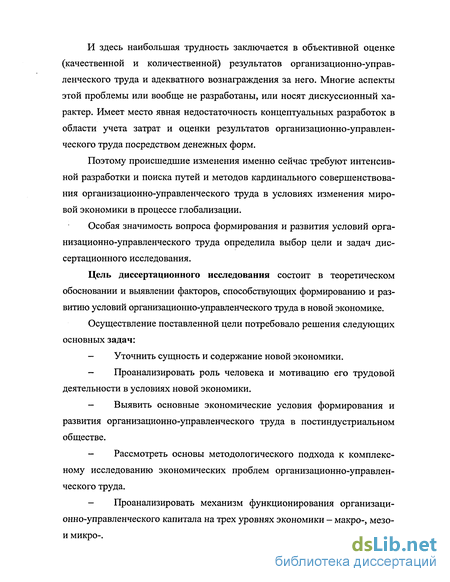 Цель диссертационного исследования состоит в теоретическом обосновании и выявлении факторов, способствующих формированию и развитию условий организационно-управленческого труда в новой экономике.