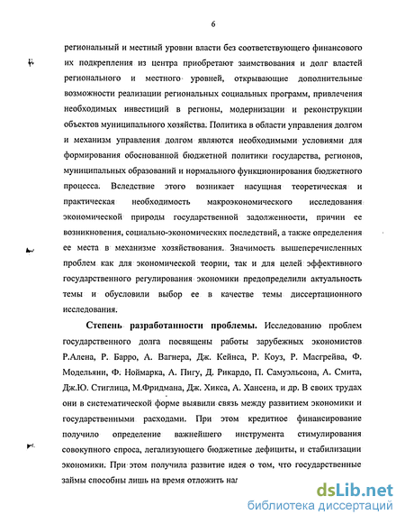 Степень разработанности проблемы. Исследованию проблем государственного долга посвящены работы зарубежных экономистов Р.Алена, Р. Барро, А. Вагнера, Дж. Кейнса, Р. Коуз, Р. Масгрейва, Ф. Модельяни, Ф. Ноймарка, А. Пигу, Д. Рикардо, П. Самуэльсона, А. Смита, Дж.Ю. Стиглица, М.Фридмана, Дж. Хикса, А. Хансена, и др. В своих трудах они в систематической форме выявили связь между развитием экономики и государственными расходами. При этом кредитное финансирование получило определение важнейшего инструмента стимулирования совокупного спроса, легализующего бюджетные дефициты, и стабилизации экономики. При этом получила развитие идея о том, что государственные займы способны лишь на время отложить налоговые сборы с экономических
