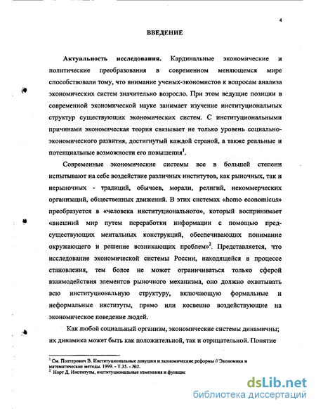 Значение институтов для социально-экономической практики все более отчетливо осознается российскими и зарубежными исследователями. При подготовке диссертации автор опирался на труды А.Алчиана, Р.Коуза, Д.Норта, О.Уильямсона, Р.Познера, В.Автономова, В.Дементьева, Б.Ерзникяна, ГМСлейнера, Д.Львова, В.Маевского, С.Малахова, В.Макарова, А.Нестеренко, Р.Нуреева, А.Олейника, В.Тамбовцева, А.Шаститко и др.