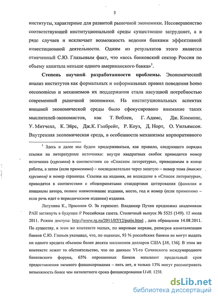 Латухина К., Прасолов О. За горизонт. Владимир Путин предложил академикам РАН заглянуть в будущее // Российская газета. Столичный выпуск № 5525 (149). 12 июля 2011. Режим доступа: , дата обращения 14.08.2011. По .существу, в этом же контексте малых, по мировым меркам, размеров капитализации банков СЮ. Глазьев указывал, что, по оценкам, 93 % российских банков не могут выдать ни одного кредита объемом более десяти миллионов долларов США [38, 136]. В этом же контексте лежит то обстоятельство, что по данным VI-го Сочинского международного банковского форума, 65% опрошенных банков называют предельный срок предоставления заемного финансирования — пять лет, и только 13% могут рассматривать возможность более чем пятилетнего срока финансирования [148, 123]. управления в неразрывности их экономических и юридических аспектов, стала одним из основных предметов исследований А. Берли".