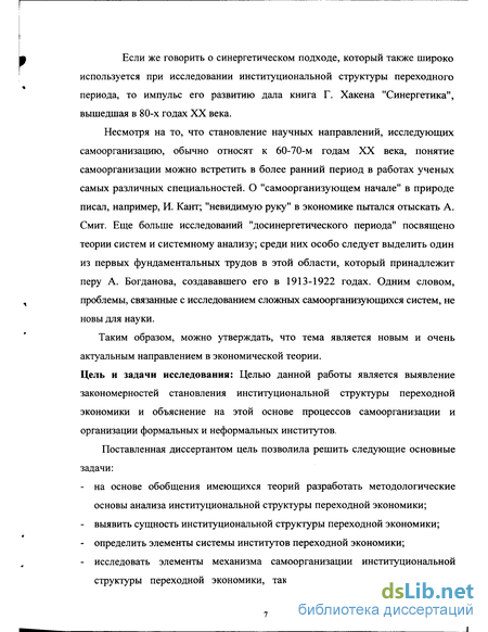 Цель и задачи исследования: Целью данной работы является выявление закономерностей становления институциональной структуры переходной экономики и объяснение на этой основе процессов самоорганизации и организации формальных и неформальных институтов.