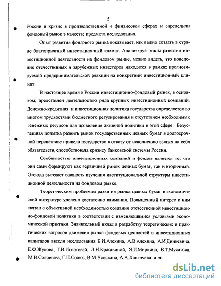 Теоретическим проблемам развития рынка ценных бумаг в экономической литературе уделено достаточно внимания. Повышенный интерес к ним связан с объективной необходимостью создания отечественной инвестиционно-фондовой политики в соответствии с изменяющимися условиями экономической практики. Значительный вклад в разработку теоретических и практических вопросов движения рынка фондовых ценностей и инвестиционных капиталов внесли исследования Б.И.Алехина, А.В.Алехина, А.И.Динкевича, Е.Ф.Жукова, Т.В.Игнатовой, Л.Н.Красавиной, Я.И.Миркина, В.Т,Мусатова, М.В,Соловьева, Г.П.Солюс, В.М.Усоскина, А.А.Хандруева, и др.
