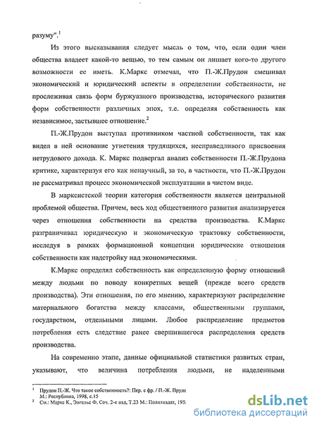 Из этого высказывания следует мысль о том, что, если один член общества владеет какой-то вещью, то тем самым он лишает кого-то другого возможности ее иметь. К.Маркс отмечал, что П.-Ж.Прудон смешивал экономический и юридический аспекты в определении собственности, не прослеживая связь форм буржуазного производства, исторического развития форм собственности различных эпох, т.е. определяя собственность как независимое, застывшее отношение.2