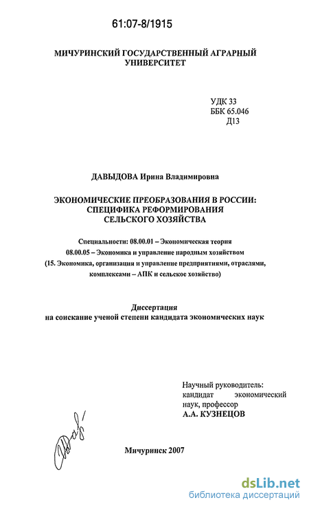 По специальности 08.00 05. - Экономика и управление народным хозяйством (15.40. Реформирование сельского хозяйства):