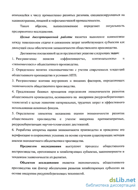 Объектом исследования является экономичность общественного производства как фактор обеспечения развития хозяйствующих субъектов на основе внедрения ресурсосберегающих технологий.