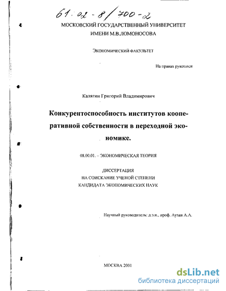 Калягин Григорий Владимирович. Конкурентоспособность институтов кооперативной собственности в переходной экономике : Дис. ... канд. экон. наук : 08.00.01 : Москва, 2001 177 c. РГБ ОД, 61:02-8/700-2