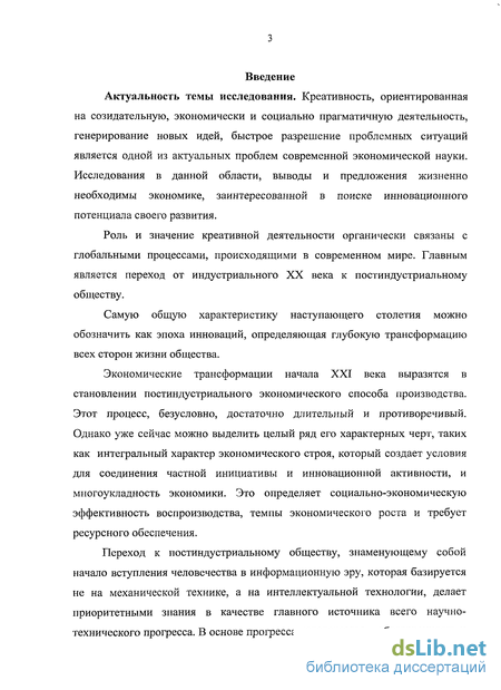 В наступающей постиндустриальной эпохе важнейшим источником конкурентного преимущества предприятий и организаций является прежде всего не материальные активы и природные ресурсы, а интеллектуальная собственность, инвестиции в человеческий капитал. В условиях рыночной экономики конкурирующие самостоятельные фирмы заинтересованы в обновлении продукции, наличии рынка нововведений (инноваций), основу которых представляет креативные идеи и решения. Поэтому для исследования креативных процессов важно осмысление специфики инновационной деятельности. Исследование инновационной деятельности стало предметом изучения российских ученых. Этой проблеме посвящен ряд фундаментальных работ: Кузик Б.Н., Яковец Ю.В. «Россия - 2050.Стратегия инновационного процесса», Фатхутдинов Р.А. «Стратегия конкурентоспособности», Хрусталев Б.В. «Механизмы технологического развития экономики России», Воронин Ю.М., Селезнев А.С., Черниченко Л.Г. «Россия: экономический рост» и др.