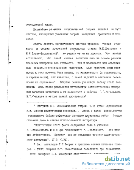 Задачу достичь органического синтеза трудовой теории стоимости и теории предельной полезности ставил В.К.Дмитриев и М.И. Туган-Барановский1, но решить ее мм не удалось. Это вполне естественно, ибо такой синтез возможен лишь на основе решения проблемы измерения как стоимости, так и полезности как объективных социально-экономических категорий. Если проблема меры стоимости к тому времени была решена, то маржиналисты (и ординалисты, и кардиналисты), как известно, с такой задачей в отношении полезности не справились2. Впервые решить указанную задачу стало возможным лишь после разработки методологии количественного измерения качества продукций и ее полезности в работах Г.Г.Азгальдова, В.Т.Смирнова и автора данной диссертации3. 1 Дмитриев В.К. Экономические очерки, Ч.1; Туган-Барановский М.И. Основы политической экономии... Здесь и далее используется сокращенное библиографическое описание цитируемых работ. Полное описание дано в списке использованной литературы. констатация этого факта содержится даже в учебнике К.Р.Макконнелла и С.Л.Брю "Экономикс": "...полезность - это понятие субъективное. Поэтому оно не поддается точному количественному измерению". (1.2. С. 31). 3 См.: Азгальдов Г.Г.Теория и практика оценки качества товаров. - 1982; Смирнов В.Т. Общественная полезность при социализме. - 1979; Сибирцев В.А. Измерение общественной полезности. - 1991.