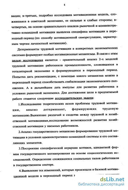 Детерминанты трудовой мотивации в конкретных экономических системах формируют особые мотивационные механизмы. В связи с этим целью исследования является - сравнительный анализ 2-х моделей трудовой мотивации работников промышленности, сложившихся в тоталитарной экономике и формирующихся в переходный период. Попытка дать рекомендации, с помощью какого механизма можно в переходный период способствовать стабилизации экономического положения, А в дальнейшем дать импульс для развития работника в условиях рыночной экономики. Для достижения цели в предлагаемой работе ставятся следующие исследовательские задачи: