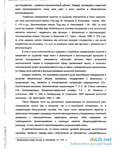В этих и иных многочисленных изданиях с подобным определением налогов и сведением их существа чаще всего к фискальной и регулирующей функциям в центре исследований оказывается налоговая система (явно вторжение экономической теории в сопредельную сферу финансовой науки), а политико-экономический аспект просматривается лишь в связи с определенными замечаниями по поводу роли налогов в функционировании рыночной экономики.