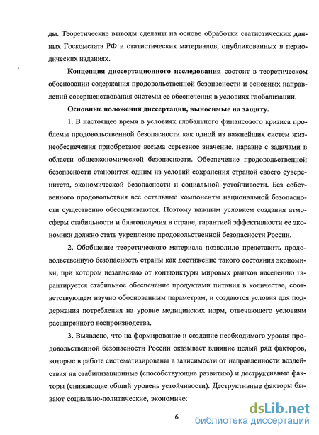 Концепция диссертационного исследования состоит в теоретическом обосновании содержания продовольственной безопасности и основных направлений совершенствования системы ее обеспечения в условиях глобализации.