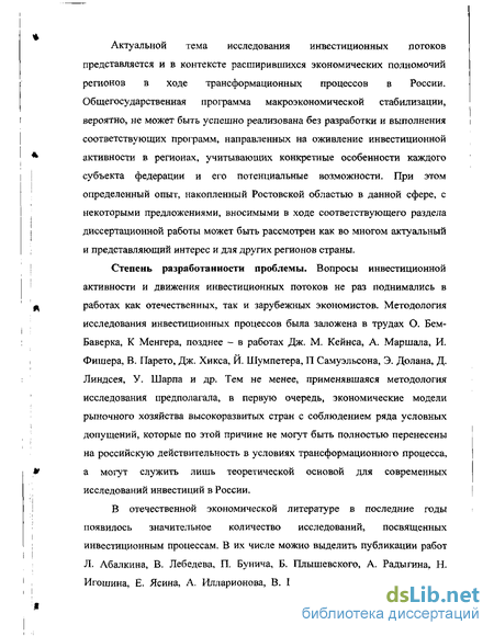 Степень разработанности проблемы. Вопросы инвестиционной активности и движения инвестиционных потоков не раз поднимались в работах как отечественных, так и зарубежных экономистов. Методология исследования инвестиционных процессов была заложена в трудах О. Бем-Баверка, К Менгера, позднее - в работах Дж. М. Кейнса, А. Маршала, И. Фишера, В. Парето, Дж. Хикса, Й. Шумпетера, П Самуэльсона, Э. Долана, Д. Линд сея, У. Шарпа и др. Тем не менее, применявшаяся методология исследования предполагала, в первую очередь, экономические модели рыночного хозяйства высокоразвитых стран с соблюдением ряда условных допущений, которые по этой причине не могут быть полностью перенесены на российскую действительность в условиях трансформационного процесса, а могут служить лишь теоретической основой для современных исследований инвестиций в России.