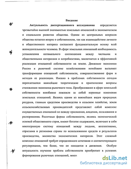 Актуальность диссертационного исследования определяется чрезвычайно высокой значимостью земельных отношений в экономическом и социальном развитии общества. Одним из центральных вопросов общества остается вопрос о собственности, так как взаимодействие личного и общественного интереса составляет фундаментальную основу всей жизнедеятельности человека. В сфере земельных отношений необходимость установления оптимального соотношения между частными и общественными интересами и потребностями, заключается в эффективной реализации отношений собственности на землю. Движение экономики России к рыночной системе хозяйствования неизбежно вызывает трансформацию отношений собственности, совершенствование форм и методов ее реализации. Именно в проблемах собственности сегодня переплетаются важнейшие теоретические и практические вопросы становления экономики рыночного типа. Преобразование в сфере земельной собственности неизбежно повлекли за собой коренные изменения земельных отношений. Являясь одним из важнейших видов природных ресурсов, главным средством производства в сельском хозяйстве, земля сельскохозяйственных производителей представляет собой комплекс имущественных отношений по поводу присвоения, владения, пользования и распоряжения. Различные формы собственности, являясь экономической основой общественного строя, имеют богатое содержание, включают в себя многогранную систему отношений между людьми, коллективами, отраслями и регионами страны по использованию средств и результатов производства, множество экономических интересов. Этот сложный комплекс отношений требует определенного сочетания и соответствующего регулирования, тем более, что он находится в движении. Особую актуальность изучение проблем собственности приобретает в условиях формирования рыночных отношений, многообразие форм собственности и хозяйствования, так как объекты различных форм присвоения могут активно воздействовать на процесс производства, распределение обмена и потребления материальных и духовных благ.