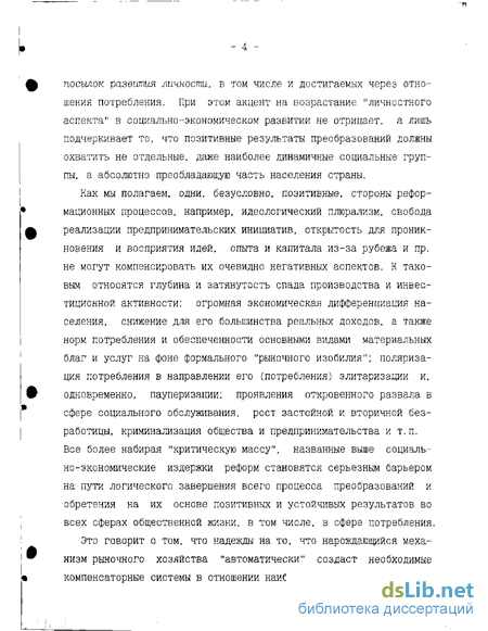 Как мы полагаем, одни, безусловно, позитивные, стороны рефор-мационных процессов, например, идеологический плюрализм, свобода реализации предпринимательских инициатив, открытость для проникновения и восприятия идей, опыта и капитала из-за рубежа и пр. не могут компенсировать их очевидно негативных аспектов. К таковым относятся глубина и затянутохть спада производства и инвестиционной активности; огромная экономическая дифференциация населения, снижение для его большинства реальных доходов, а также норм потребления и обеспеченности основными видами материальных благ и услуг на фоне формального "рыночного изобилия"; поляризация потребления в направлении его [потребления) элитаризации и, одновременно, пауперизации; проявления откровенного развала в сфере социального обслуживания, рост застойной и вторичной безработицы, криминализация общества и предпринимательства и т.п. Все более набирая "критическую массу", названные выше социально-экономические издержки реформ становятся серьезным барьером на пути логического завершения всего процесса преобразований и обретения на их основе позитивных и устойчивых результатов во всех сферах общественной жизни, в том числе, в сфере потребления.
