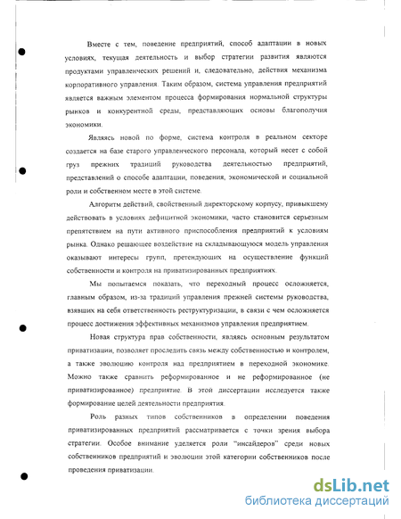 Новая структура прав собственности, являясь основным результатом приватизации, позволяет проследить связь между собственностью и контролем, а также эволюцию контроля над предприятием в переходной экономике. Можно также сравнить реформированное и не реформированное (не приватизированное) предприятие В этой диссертации исследуется также формирование целей деятельности предприятия.