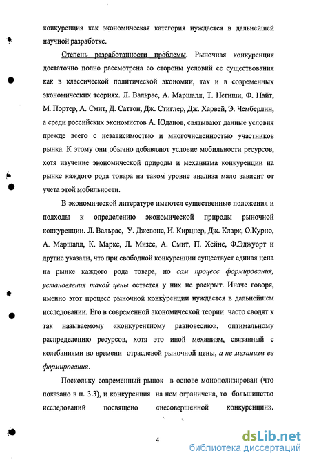 Степень разработанности проблемы. Рыночная конкуренция достаточно полно рассмотрена со стороны условий ее существования как в классической политической экономии, так и в современных экономических теориях. Л. Вальрас, А. Маршалл, Т. Негиши, Ф. Найт, М. Портер, А. Смит, Д. Саттон, Дж. Стиглер, Дж. Харвей, Э. Чемберлин, а среди российских экономистов А. Юданов, связывают данные условия прежде всего с независимостью и многочисленностью участников рынка. К этому они обычно добавляют условие мобильности ресурсов, хотя изучение экономической природы и механизма конкуренции на рынке каждого рода товара на таком уровне анализа мало зависит от учета этой мобильности.