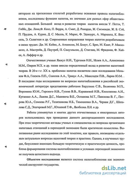 Работы упомянутых и многих других отечественных и иностранных авторов использовались при проведении данного диссертационного исследования. При этом теоретические взгляды ученых и специалистов по вопросам организации налоговых отношений в переходной экономике были критически осмыслены. Выполненные ранее исследования по этой тематике, как правило, посвящены отдельным актуальным вопросам налоговой теории и практики. Однако, в изученных трудах, безусловно имеющих большую теоретическую и практическую ценность, проблема формирования системы налогообложения в условиях переходной экономики не получила целостного подхода.