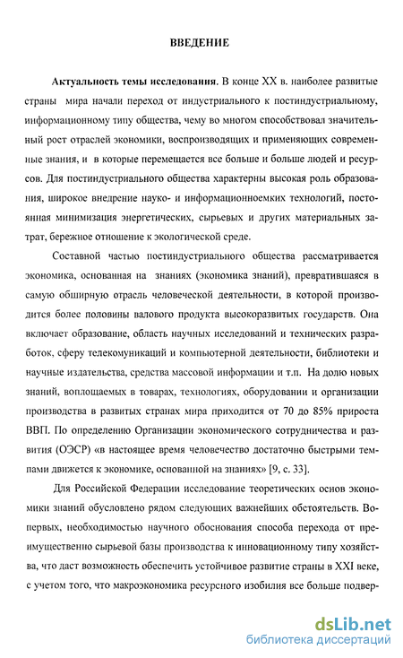 Актуальность темы исследования. В конце XX в. наиболее развитые страны мира начали переход от индустриального к постиндустриальному, информационному типу общества, чему во многом способствовал значительный рост отраслей экономики, воспроизводящих и применяющих современные знания, и в которые перемещается все больше и больше людей и ресурсов. Для постиндустриального общества характерны высокая роль образования, широкое внедрение науко- и информационноемких технологий, постоянная минимизация энергетических, сырьевых и других материальных затрат, бережное отношение к экологической среде.