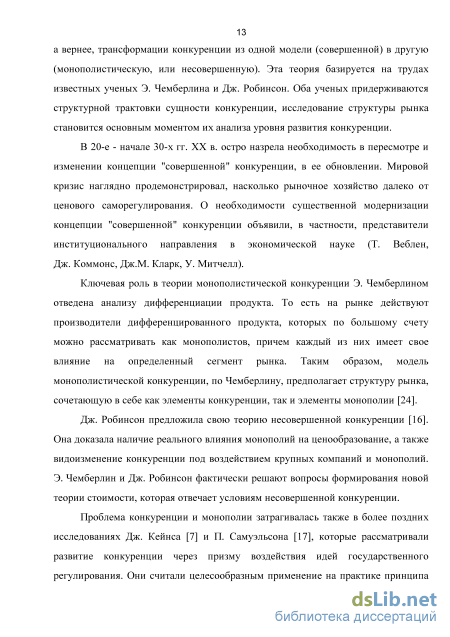 В начале XX в. выработка различных подходов к изучению конкуренции фактически была завершена. Мировой экономический кризис 1929-1933 гг. внес существенные коррективы в теоретические представления о сущности конкуренции и способствовал рождению новой теории монополии и конкуренции, а вернее, трансформации конкуренции из одной модели (совершенной) в другую (монополистическую, или несовершенную). Эта теория базируется на трудах известных ученых Э. Чемберлина и Дж. Робинсон. Оба ученых придерживаются структурной трактовки сущности конкуренции, исследование структуры рынка становится основным моментом их анализа уровня развития конкуренции.