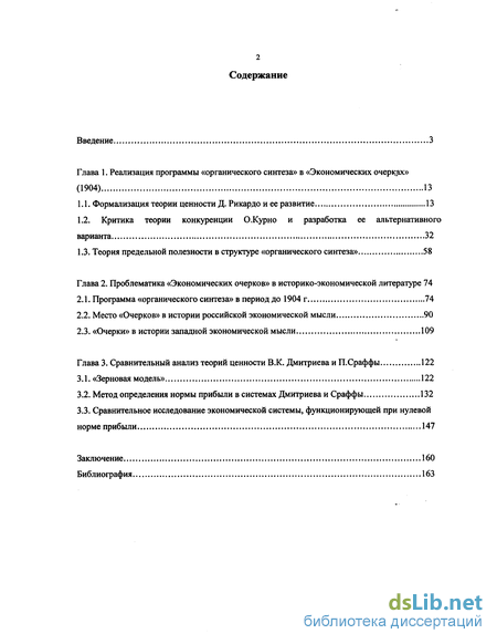 В третьей главе «Сравнительный анализ теорий ценности В.К. Дмитриева и П.Сраффы» решается вопрос о теоретической состоятельности Дмитриевской теории в контексте интерпретации рикардианского наследия. Система П.Сраффы, которая реализует механизм определения относительных цен, не требующий обращения к категории потребительского спроса, ставится в оппозицию Дмитриевским «Очеркам» -первая часть «Производства товаров посредством товаров» первому очерку. Соответственно трем выделенным частям первого очерка, а также с учетом сраффианской критики «догмы Смита» и теории издержек производства в целом исследование распадается на три составляющие и соответственно три параграфа: «зерновую модель»; метод определения нормы прибыли посредством решения системы одновременных уравнений; анализ экономической системы, функционирующей при нулевой норме прибыли (г = 0).