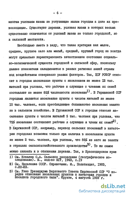 Необходимо иметь в виду, что такие критерии как малое, среднее, крупное село или малый, средний, крупный город не всегда могут правильно характеризовать качественное состояние социально-экономической сущности городской и сельской сфер, поскольку данные показатели складываются в разных регионах нашей страны под воздействием совершенно разных факторов. Так, ЦСУ РСФСР относит к городам населенные пункты с населением не менее 12 тыс. жителей при условии, что рабочие и служащие с членами их семей составляют не менее 85% численности населения1'. Б Украинской ССР городами являются населенные пункты с числом жителей не менее 10 тыс. человек, если преобладающее большинство населения занято не в сельском хозяйстве. В Грузинской ССР к городам относят населенные пункты с числом жителей 5 тыс. человек при условии, что 75$ населения составляют рабочие и служащие и члены их семей^. В Киргизской ССР, например, перевод сельских поселений в категорию городских возможен только при наличии в населенном пункте не менее 2 тыс. человек, при условии, что 85$ из него не заняты в отраслях сельскохозяйственного производства^'. То же самое можно сказать и в отношении деревни. Так, в Краснодарском крае