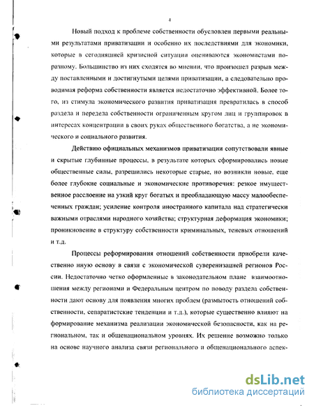 Процессы реформирования отношений собственности приобрели качественно иную основу в связи с экономической суверенизацией регионов России. Недостаточно четко оформленные в законодательном плане взаимоотношения между регионами и Федеральным центром по поводу раздела собственности дают основу для появления многих проблем (размытость отношений собственности, сепаратистские тенденции и т.д.), которые существенно влияют на формирование механизма реализации экономической безопасности, как на региональном, так и общенациональном уровнях. Их решение возможно только на основе научного анализа связи регионального и общенационального аспек тов реформирования собственности и обеспечения экономической безопасности.
