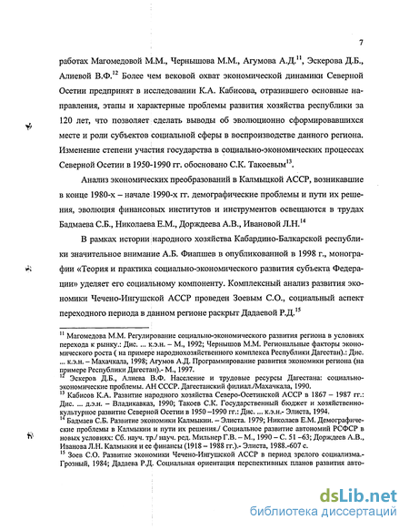 работах Магомедовой М.М., Чернышева М.М., Агумова А.Д.11, Эскерова Д.Б., Алиевой В.Ф.12 Более чем вековой охват экономической динамики Северной Осетии предпринят в исследовании К.А. Кабисова, отразившего основные направления, этапы и характерные проблемы развития хозяйства республики за 120 лет, что позволяет сделать выводы об эволюционно сформировавшихся месте и роли субъектов социальной сферы в воспроизводстве данного региона. Изменение степени участия государства в социально-экономических процессах Северной Осетии в 1950-1990 гг. обосновано С.К. Такоевым13.