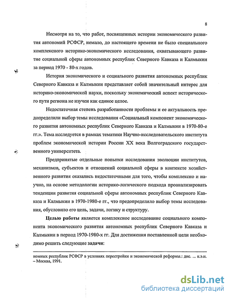 Несмотря на то, что работ, посвященных истории экономического развития автономий РСФСР, немало, до настоящего времени не было специального комплексного историко-экономического исследования, охватывающего развитие социальной сферы автономных республик Северного Кавказа и Калмыкии за период 1970 - 80-х годов.