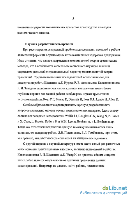 При рассмотрении центральной проблемы диссертации, исходной в работе является информация о трансакциях и трансакционных издержках предприятия. Надо отметить, что данное направление экономической теории сравнительно молодое, что в особенности касается отечественного научного знания и определяет размытый операциональный характер многих понятий теории трансакций. Среди отечественных исследователей особо значимые для диссертации работы Шаститко А.Е, Нуреев Р, В. Автономова, Капелюшникова Р. И. Западная экономическая мысль в данном направлении имеет более глубокие корни и для данной работы особую роль играют труды таких исследователей как Коуз Р.Г, Менар К, Demsetz Н, Foss N.J., Lando Н, Allen D.