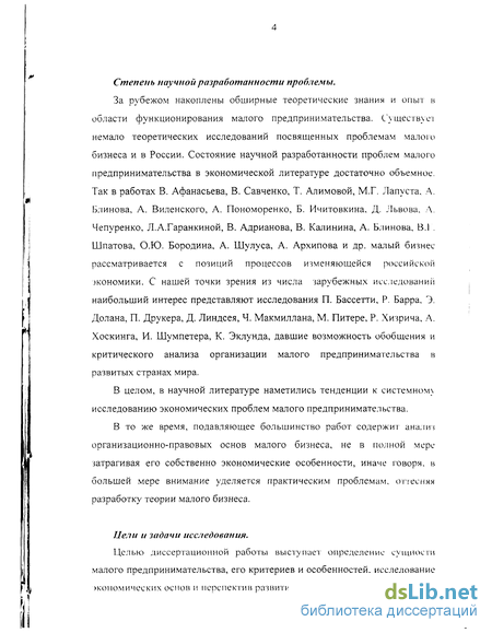 За рубежом накоплены обширные теоретические знания и опыт в области функционирования малого предпринимательства. Существуеі немало теоретических исследований посвященных проблемам малого бизнеса и в России. Состояние научной разработанности проблем малого предпринимательства в экономической литературе достаточно объемное. Так в работах В. Афанасьева, В. Савченко, Т. Алимовой, М.Г. Лапуста, А. Блинова, А. Виленского, А. Пономоренко, Б. Ичитовкина, Д. Львова, А. Чепуренко, Л.А.Гаранкиной, В. Адрианова, В. Калинина, А. Блинова, В.1 . Шпатова, О.Ю. Бородина, А. Шулуса, А. Архипова и др. малый бизнес рассматривается с позиций процессов изменяющейся российской жономики. С нашей точки зрения из числа зарубежных исследований наибольший интерес представляют исследования П. Бассетти, Р. Барра, Э. Долана, П. Друкера, Д. Линдсея, Ч. Макмиллана, М. Питере, Р. Хизрича, А. Хоскинга, И. Шумпетера, К. Эклунда, давшие возможность обобщения и критического анализа организации малого предпринимательства в развитых странах мира.