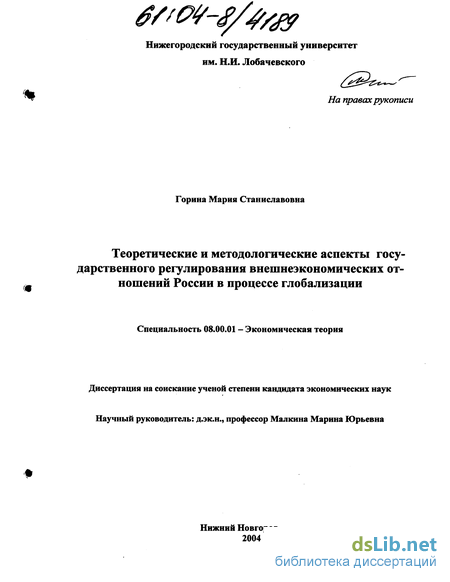 Ее достижение выдвинуло постановку и решение следующих задач: выявление экономической природы и сущности внешнеэкономических отношений и внешнеэкономического регулирования, изучение их внутренней структуры и определение их роли в процессе глобализации; анализ основных теорий международного обмена и открытости экономики с точки зрения их применимости для объяснения процессов глобализации и интеграции России в мировое хозяйство; определение допустимой: степени либерализации внешней; торговли с учетом места России в мировой экономике и специфических задач, стоящих перед ней на современном этапе; использование основных положений институциональной * теории с целью объяснения направленности и закономерностей эволюции внешнеэкономических отношений, изучения? функциональной,1 ролш Всемирной Торговой Организации в мировой экономике и выявления институциональных особенностей присоединения России к ВТО; выяснение пределов управляемости процессом интеграции российской экономики в мировое хозяйство на примере вхождения России в ВТО с учетом жесткости отдельных требований и возможностей торгов; комплексный анализ вероятных макроэкономических выгод и потерь, последствию краткосрочного, и? долгосрочного характера, их обусловленности факторами внутренней и внешней среды, изучение отраслевых и региональных последствий присоединения России к ВТО; разработка стратегических направлений совершенствования механизмов государственного регулирования; внешнеэкономических отношений; в новых условиях.