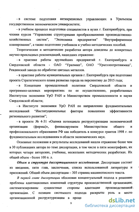 В первой главе диссертации обоснован концептуальный подход к решению проблемы адаптационных изменений структуры производственной организации; систематизированы сущностные стороны адаптации производственной организации. С позиции системного подхода раскрыты роль и место организационной реструктуризации в процессах адаптационных изменений