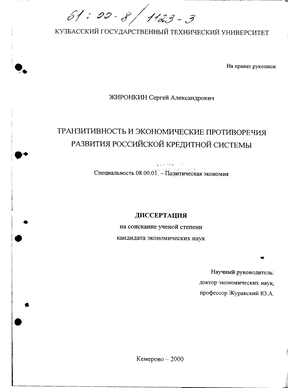 Кредитная система страны образуется совокупностью кредитных отношений, приходящихся на определенный исторический период, между различными ее субъектами — кредитными учреждениями финансового сектора экономики, производственными предприятиями, населением. Ее транзитивность обусловлена фактическим расхождением между требованиями, предъявляемыми к ней экономикой, в которой набирают силу рыночные отношения, и глубиной проникновения в нее рыночных преобразований. Это проявляется в том, что транзитивной кредитной системе России присущи качественные признаки, свойственные дореформенной экономике СССР, а также в том, что связанные с этим противоречия не получают своевременного разрешения, но только углубляются. Следствием транзитивности кредитной системы является значительное отклонение ее развития от первоначальных целей реформирования, а также опасность разрушения рыночного механизма ее функционирования.